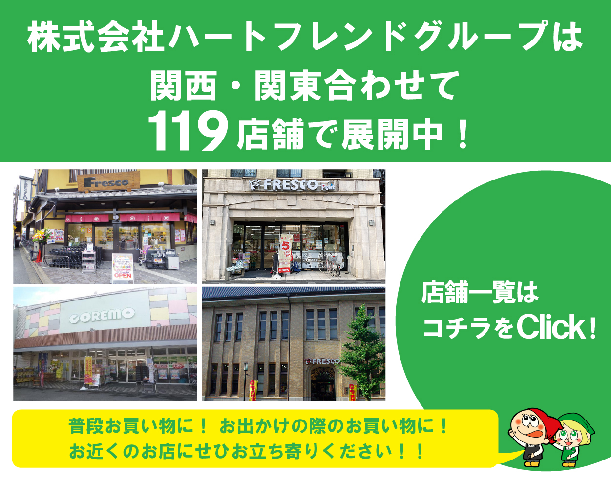 向島店 住所 〒612-8122 京都市伏見区向島庚申町119 営業時間 9:00~21:00 電話番号 075-603-9641 駐車場 9台 地図を見る パート・アルバイト募集中 おすすめ情報 チラシ情報 フレスコ 向島店のチラシ・特売情報 ご利用できるサービス クレジット・電子マネーについて メンバーズカード オリジナルマイバッグ フレちゃんのプロフィール フレちゃんLINEスタンプ発売中! 牛の個体識別情報検索サービス